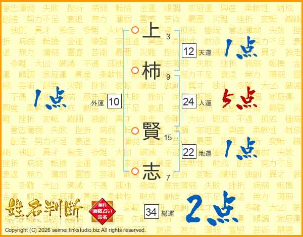 生活面を象徴する運勢です。外部から受ける影響力を表し、結婚運、家庭運や職場、環境への順応性を表します。総運から人運を引いた画数。姓や名が1文字の場合を除く。