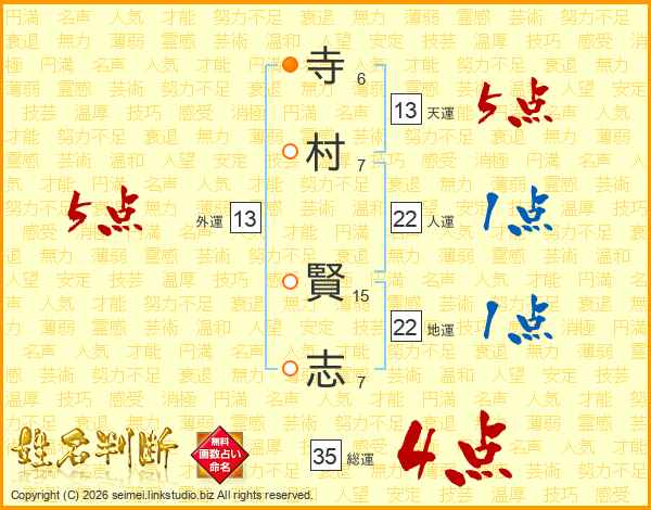 寺(6画)村(7画) 賢(15画)志(7画)