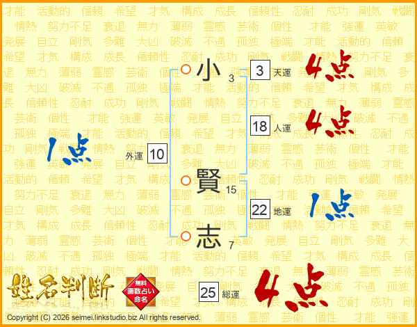 生活面を象徴する運勢です。外部から受ける影響力を表し、結婚運、家庭運や職場、環境への順応性を表します。総運から人運を引いた画数。姓や名が1文字の場合を除く。