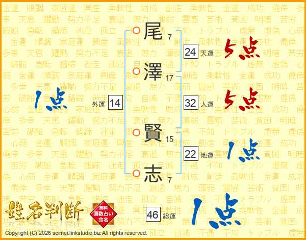尾(7画)澤(17画) 賢(15画)志(7画)
