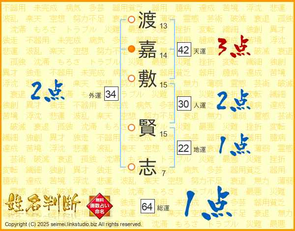 渡(13画)嘉(14画)敷(15画) 賢(15画)志(7画)