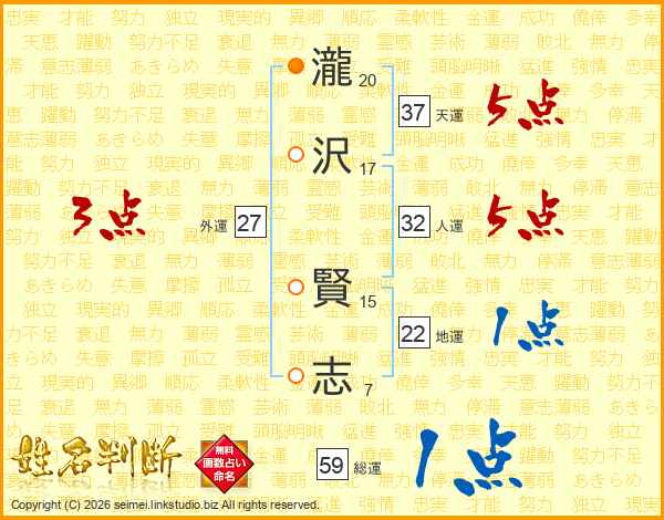 瀧沢賢志さんの総運は59画の1点!