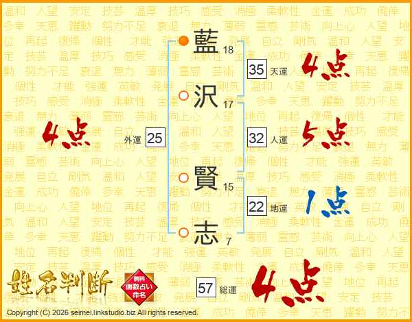 藍(18画)沢(17画) 賢(15画)志(7画)