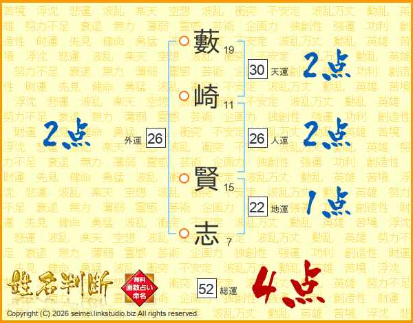 藪(19画)崎(11画) 賢(15画)志(7画)