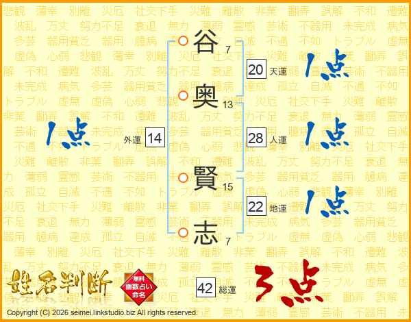 谷(7画)奥(13画) 賢(15画)志(7画)