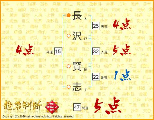 長(8画)沢(17画) 賢(15画)志(7画)
