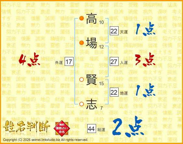 生活面を象徴する運勢です。外部から受ける影響力を表し、結婚運、家庭運や職場、環境への順応性を表します。総運から人運を引いた画数。姓や名が1文字の場合を除く。