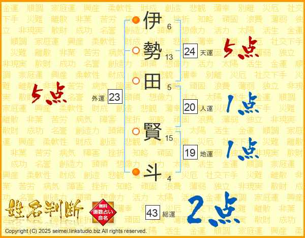 伊(6画)勢(13画)田(5画) 賢(15画)斗(4画)