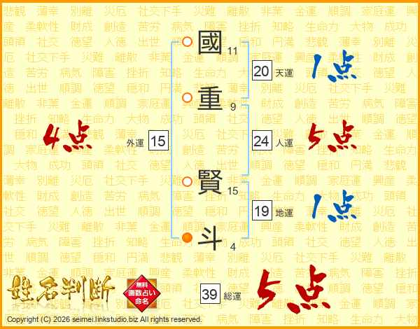 國重賢斗さんの総運は39画の5点!