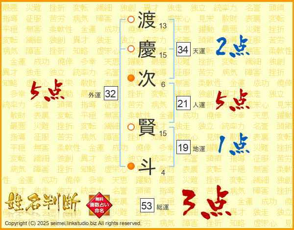 渡(13画)慶(15画)次(6画) 賢(15画)斗(4画)
