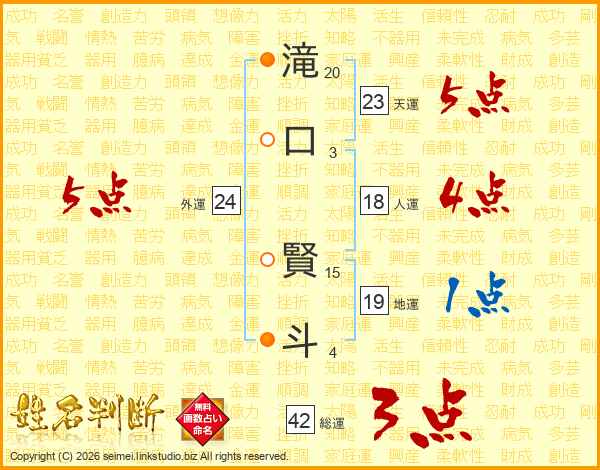 滝(20画)口(3画) 賢(15画)斗(4画)