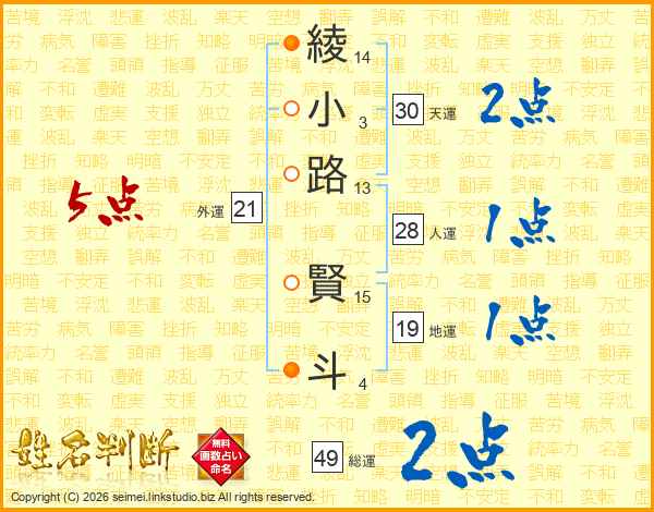 綾小路賢斗さんの外運は21画の5点!