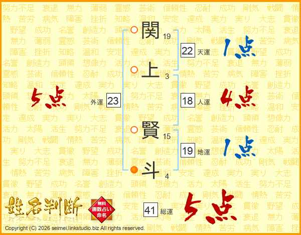関上賢斗さんの総運は41画の5点!