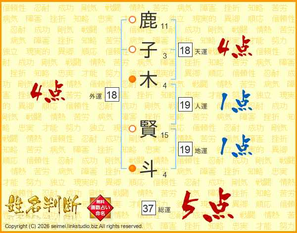 鹿(11画)子(3画)木(4画) 賢(15画)斗(4画)