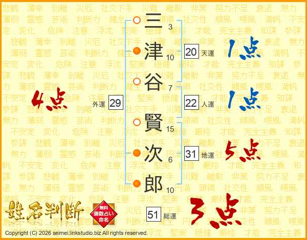 三(3画)津(10画)谷(7画) 賢(15画)次(6画)郎(10画)