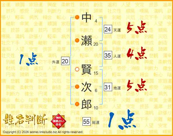 中(4画)瀬(20画) 賢(15画)次(6画)郎(10画)