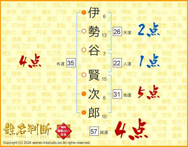 伊(6画)勢(13画)谷(7画) 賢(15画)次(6画)郎(10画)