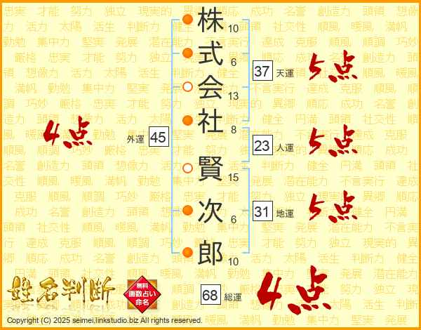 株(10画)式(6画)会(13画)社(8画) 賢(15画)次(6画)郎(10画)