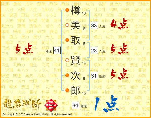 樽(16画)美(9画)取(8画) 賢(15画)次(6画)郎(10画)