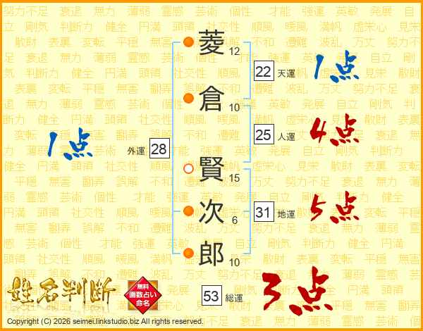 菱(12画)倉(10画) 賢(15画)次(6画)郎(10画)