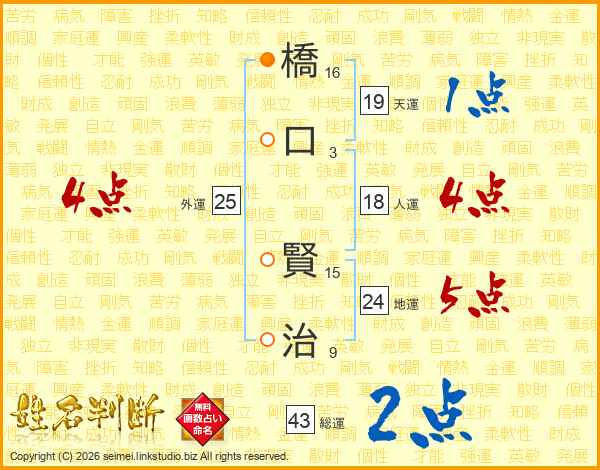 あなたの人生を表す1番重要な運勢です。生涯を通じて影響する総合運となり、主に50歳以降の晩年期に影響を及ぼします。苗字と名前の合計画数。
