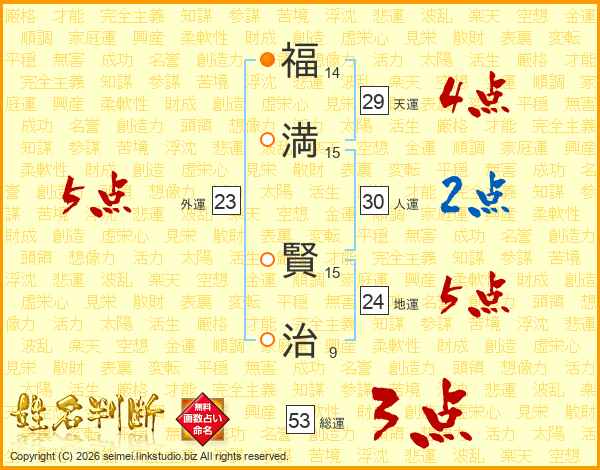 あなたの人生を表す1番重要な運勢です。生涯を通じて影響する総合運となり、主に50歳以降の晩年期に影響を及ぼします。苗字と名前の合計画数。