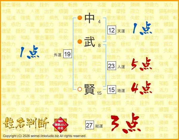 中(4画)武(8画) 賢(15画)