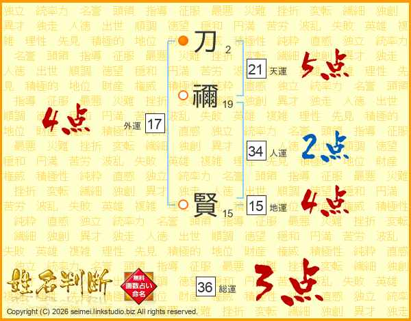 刀禰賢さんの人運は34画の2点!