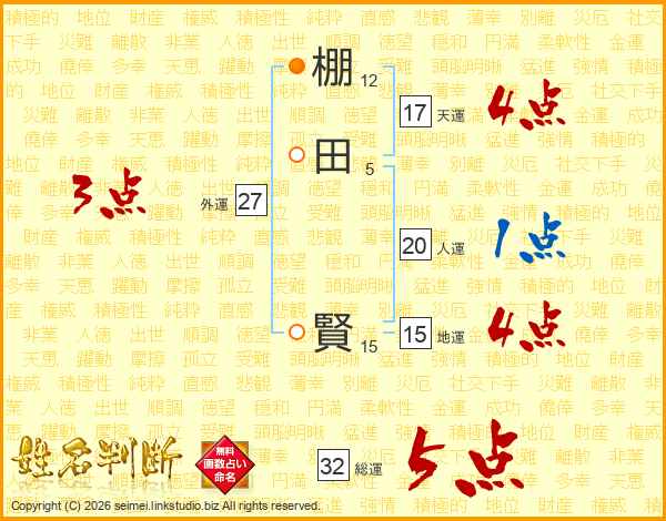 棚(12画)田(5画) 賢(15画)