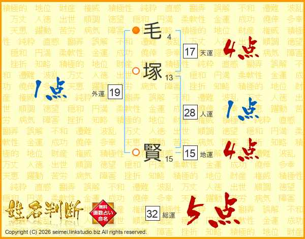 生活面を象徴する運勢です。外部から受ける影響力を表し、結婚運、家庭運や職場、環境への順応性を表します。総運から人運を引いた画数。姓や名が1文字の場合を除く。