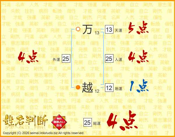 生活面を象徴する運勢です。外部から受ける影響力を表し、結婚運、家庭運や職場、環境への順応性を表します。総運から人運を引いた画数。姓や名が1文字の場合を除く。