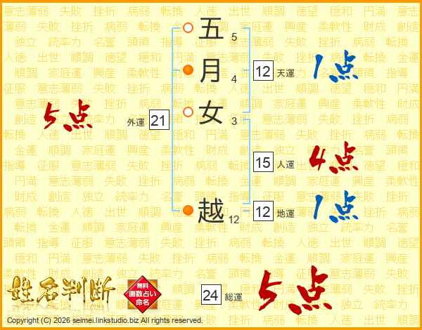 生活面を象徴する運勢です。外部から受ける影響力を表し、結婚運、家庭運や職場、環境への順応性を表します。総運から人運を引いた画数。姓や名が1文字の場合を除く。