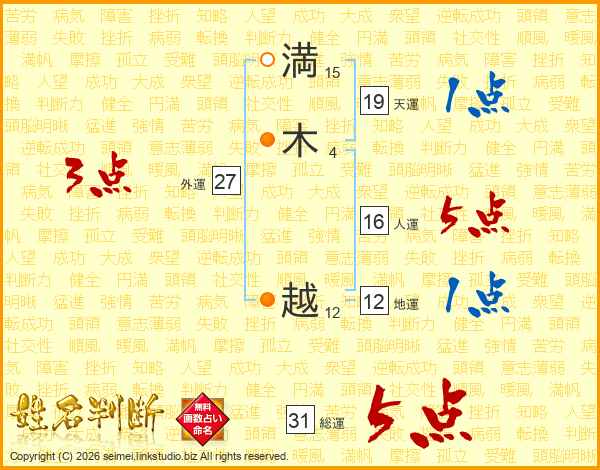 あなたの人生を表す1番重要な運勢です。生涯を通じて影響する総合運となり、主に50歳以降の晩年期に影響を及ぼします。苗字と名前の合計画数。