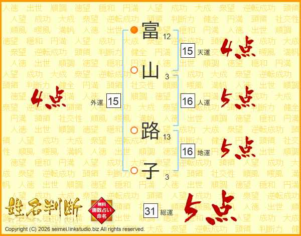 あなたの人生を表す1番重要な運勢です。生涯を通じて影響する総合運となり、主に50歳以降の晩年期に影響を及ぼします。苗字と名前の合計画数。