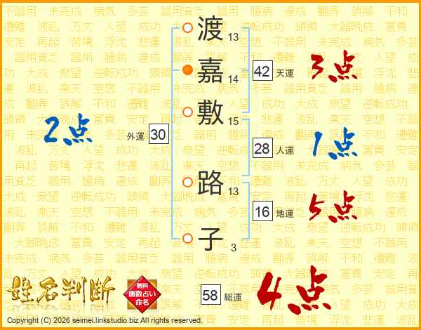 渡嘉敷路子さんの総運は58画の4点!