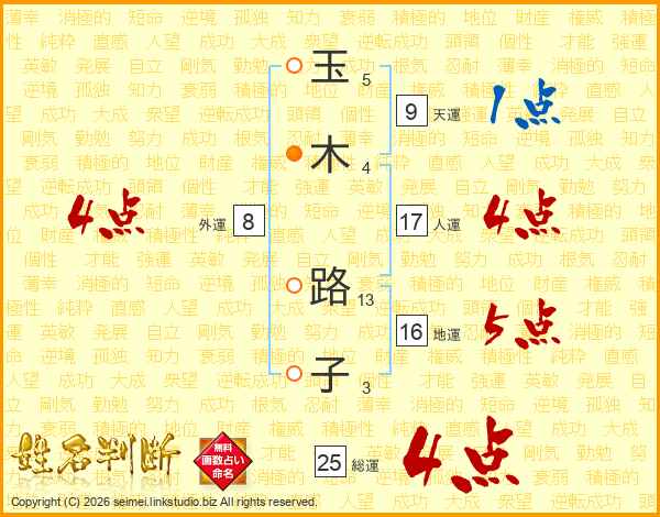 玉(5画)木(4画) 路(13画)子(3画)