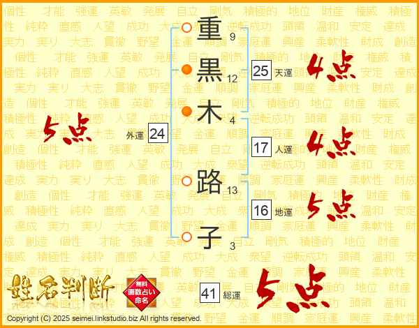 重(9画)黒(12画)木(4画) 路(13画)子(3画)