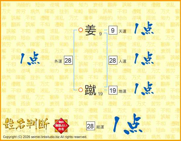 姜蹴さんの総運は28画の1点!