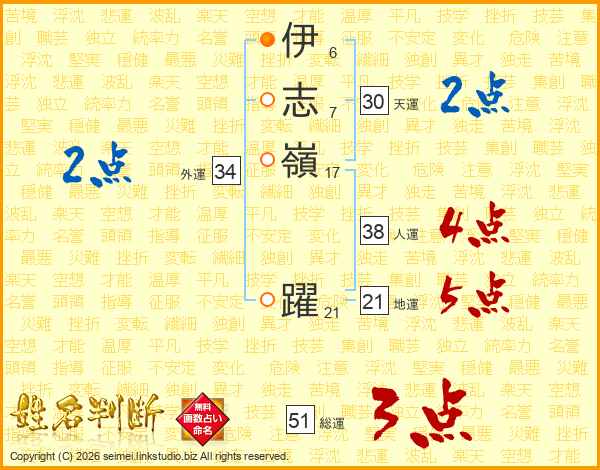 伊(6画)志(7画)嶺(17画) 躍(21画)