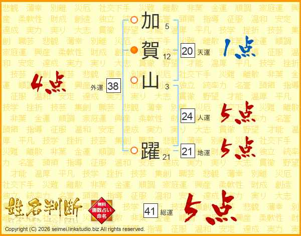生活面を象徴する運勢です。外部から受ける影響力を表し、結婚運、家庭運や職場、環境への順応性を表します。総運から人運を引いた画数。姓や名が1文字の場合を除く。