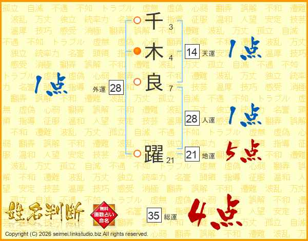 千(3画)木(4画)良(7画) 躍(21画)