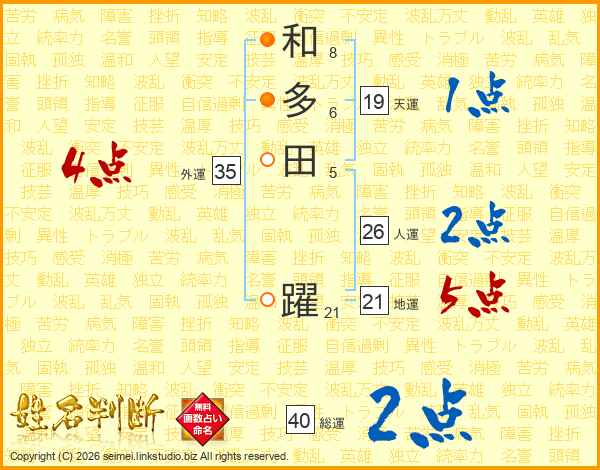 生活面を象徴する運勢です。外部から受ける影響力を表し、結婚運、家庭運や職場、環境への順応性を表します。総運から人運を引いた画数。姓や名が1文字の場合を除く。