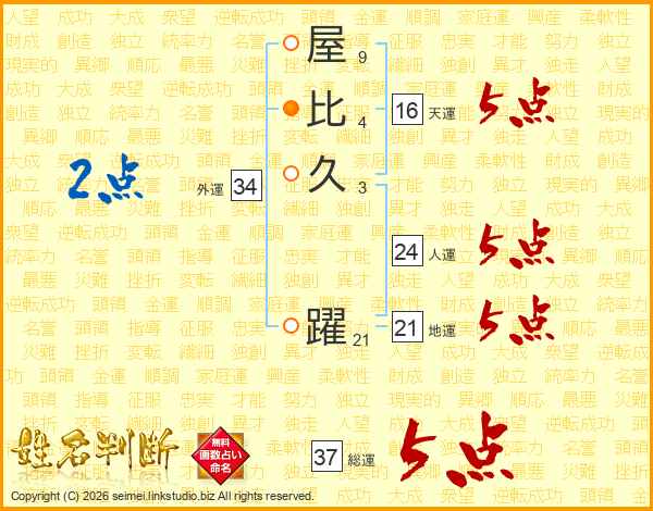 生活面を象徴する運勢です。外部から受ける影響力を表し、結婚運、家庭運や職場、環境への順応性を表します。総運から人運を引いた画数。姓や名が1文字の場合を除く。