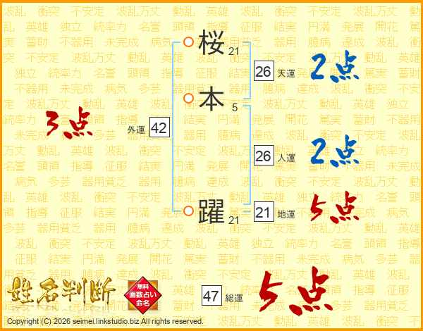 桜本躍さんの総運は47画の5点!