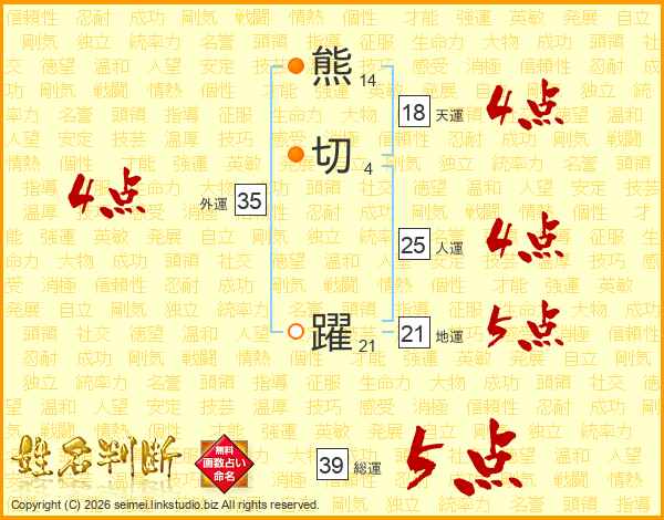熊切躍さんの総運は39画の5点!