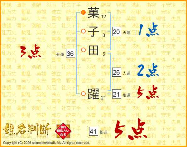 生活面を象徴する運勢です。外部から受ける影響力を表し、結婚運、家庭運や職場、環境への順応性を表します。総運から人運を引いた画数。姓や名が1文字の場合を除く。