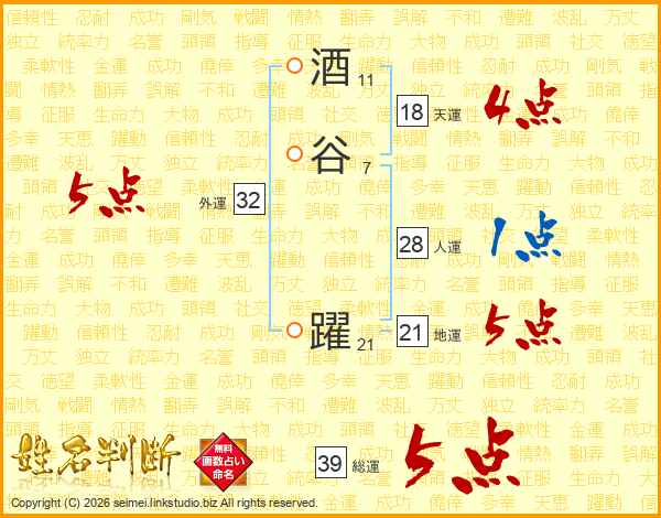 酒谷躍さんの総運は39画の5点!