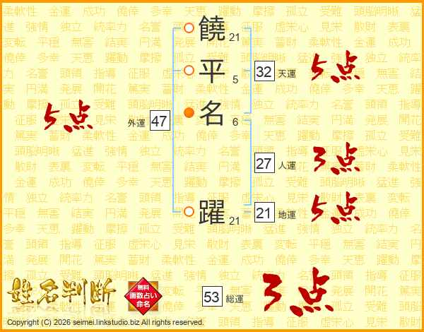 生活面を象徴する運勢です。外部から受ける影響力を表し、結婚運、家庭運や職場、環境への順応性を表します。総運から人運を引いた画数。姓や名が1文字の場合を除く。