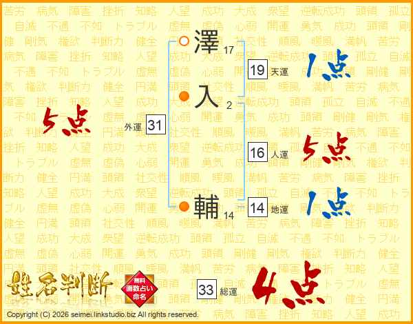 生活面を象徴する運勢です。外部から受ける影響力を表し、結婚運、家庭運や職場、環境への順応性を表します。総運から人運を引いた画数。姓や名が1文字の場合を除く。