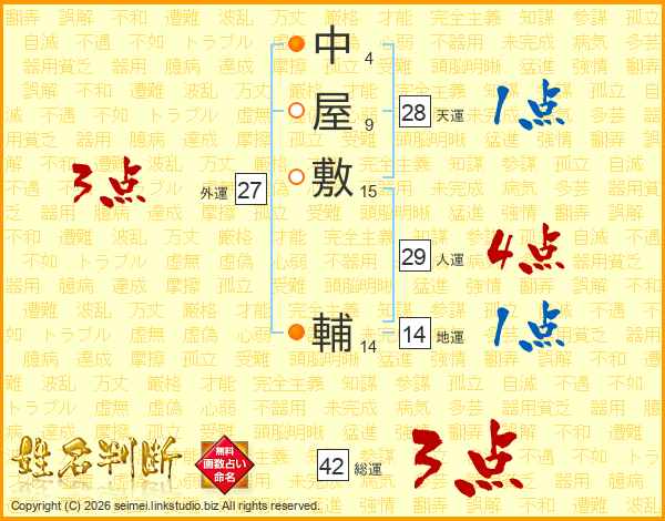 中(4画)屋(9画)敷(15画) 輔(14画)